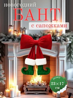 Новогодний бант на елку красный бархатный с сапогами эльфа