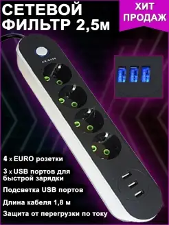 Сетевой фильтр с защитой заземлением 3 портами usb 4 розетки
