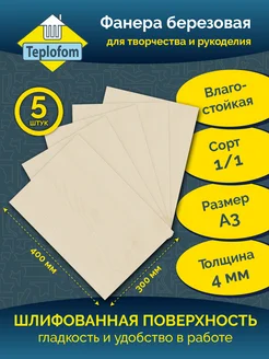 Фанера А3 4мм для творчества, выжигания, поделок – 5 листов