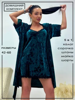 комплект женская велюровая халат и сорочка с кружевом