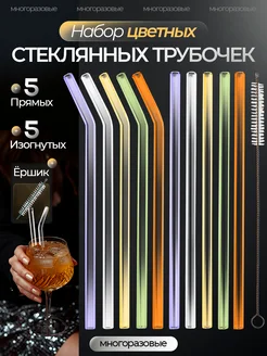 Трубочки для коктейлей и напитков стеклянные, цветные 10 шт