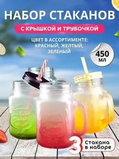 Кружка стеклянная с трубочкой, ручкой, крышкой, 450 мл 3 шт