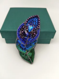 Брошь из бисера ручной работы перо жар-птицы, павлина