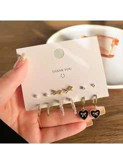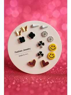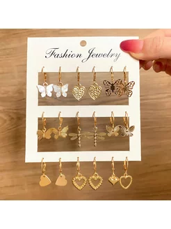 Набор 7 пар сережек - сердечки бабочки цветы Подарок девушке
