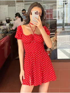 Платье крестьянка мини летнее красное в горошек
