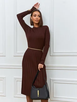 Платье трикотажное лапша миди с длинным рукавом коричневое