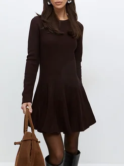 Платье трикотажное мини с длинным рукавом коричневое