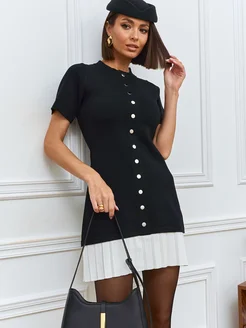 Платье трикотажное мини с контрастной юбкой плиссе черное
