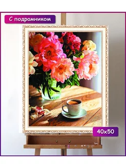 Алмазная мозаика на подрамнике 40х50 Пионы и кофе Натюрморт
