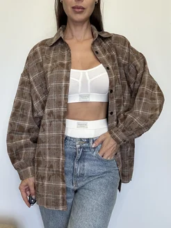 Рубашка женская в клетку оверсайз с капюшоном теплая