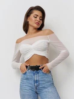 Лонгслив сетка укороченный с драпировкой и длинным рукавом