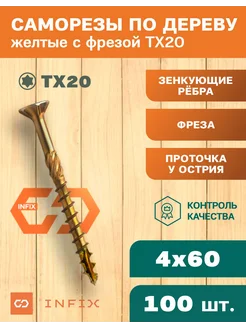 Саморезы желтые по дереву с фрезой 4х60 ЦЖ TX 20 100 шт