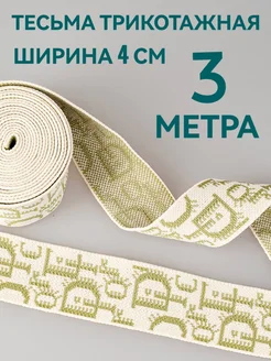 Тесьма трикотажная молочная с оливковым принтом ш.4 см, 3 м