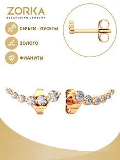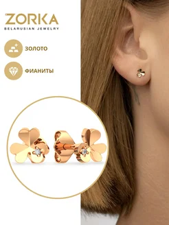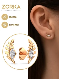 Серьги гвоздики пусеты золотые с фианитами листики перья