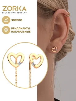Серьги сердечки золотые с натуральными бриллиантами протяжки
