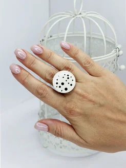 Крупное круглое белое кольцо в горошек