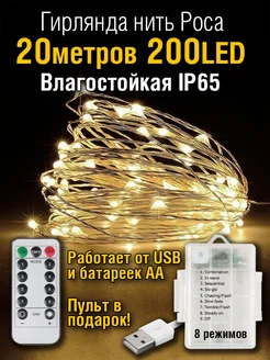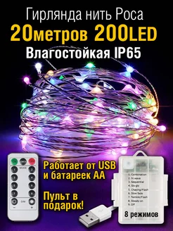 Гирлянда на батарейках 20 м уличная роса с пультом от USB