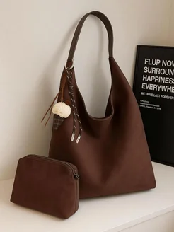 Сумка коричневая замшевая мешок на плечо с косметичкой