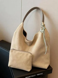 Сумка мешок бежевая на плечо большая замшевая с косметичкой