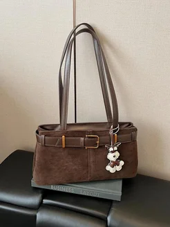 Сумка замшевая коричневая багет маленькая на плечо с брелком