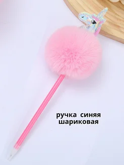 Ручка синяя Пушистое розовое облачко с радужным единорогом