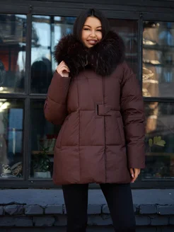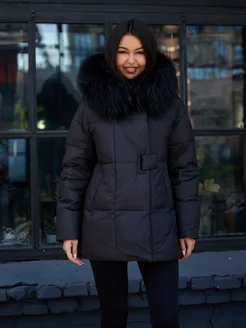 Пуховик зимний с капюшоном из меха и поясом длинный