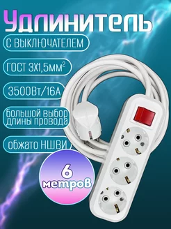 Удлинитель электрический с кнопкой выкл 3 розетки 6 метров