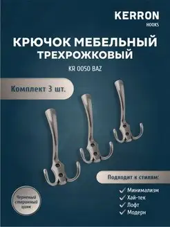 Крючок мебельный трехрожковый 3шт черненый старинный цинк
