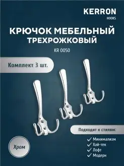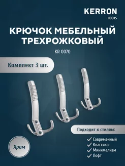 Крючок мебельный трехрожковый настенный для одежды, хром