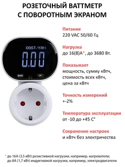 Бытовой розеточный ваттметр c подсветкой - сила тока до 16А