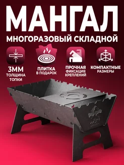 Мангал 3мм походный 53х33см складной на 9 шампуров с плиткой
