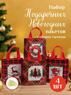 Набор подарочных новогодних пакетов 4 шт + гирлянда 2 метра