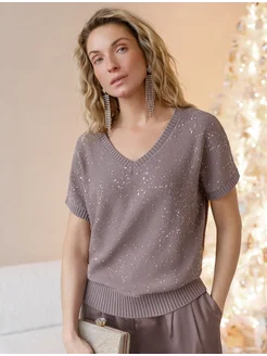 Нарядный джемпер с V вырезом и коротким рукавом с пайетками