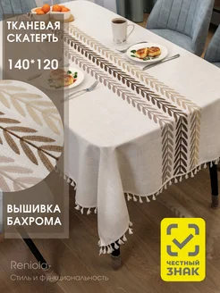 Скатерть тканевая льняная с вышивкой и бахромой 140х120см