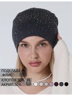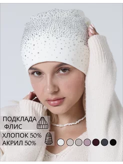 Шапка бини вязаная со стразами утепленная флис