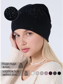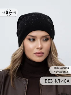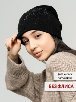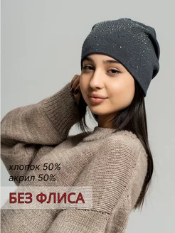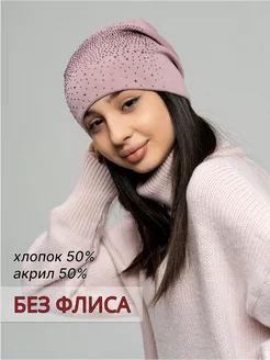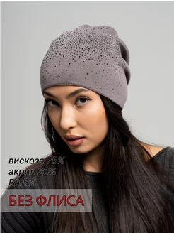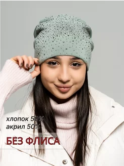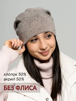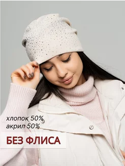 Шапка бини весенняя вязаная со стразами фиксированная сзади