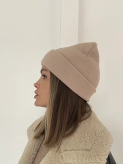 Шапка бини бежевая вязаная с отворотом