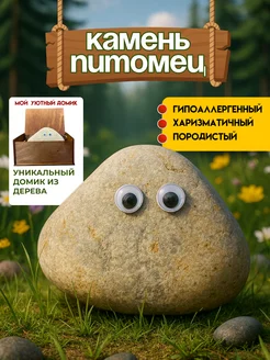 Камень питомец с глазами в деревянной подарочной упаковке