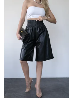 Кожаные мини шорты с резинкой из экокожи черные