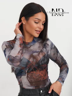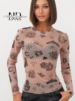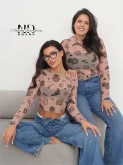 Лонгслив сетка прозрачный кроп топ с тату принтом 2yk