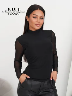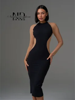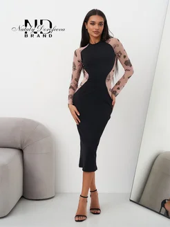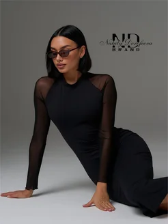 Платье трикотажное силуэтное с прозрачными рукавами сетка