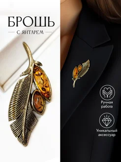 Брошь женская Перо с янтарем подарок