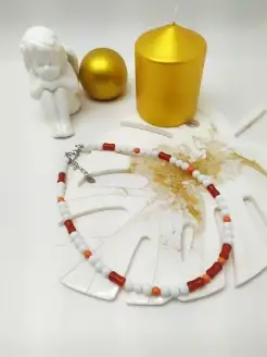 Чокер на шею белый с бусинами коралла