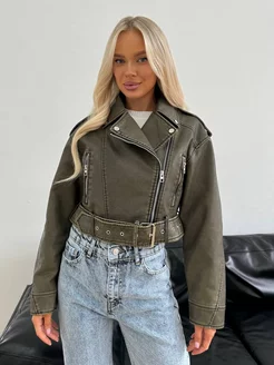 Косуха винтажная кожаная куртка оверсайз зеленая