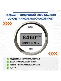 Тахометр цифровой 8000 об мин со счетчиком моточасов (WS)