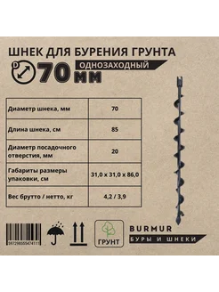 Шнек для мотобура однозаходный по грунту D-70 мм L=850 мм