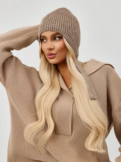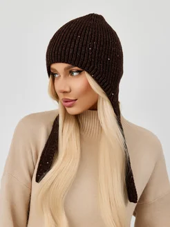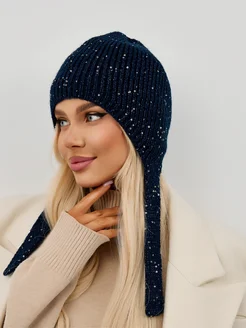 Шапка женская чепчик вязаный с пайетками на флисе
