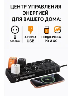 Сетевой фильтр 2 м 8 розеток + 2×PD 20W + QC3.0 + 3 USB