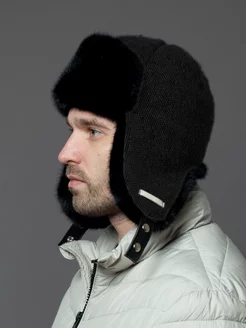 Шапка-ушанка зимняя вязаная из экомеха норки на флисе