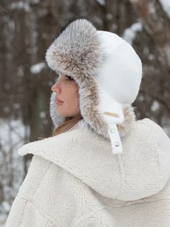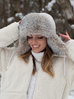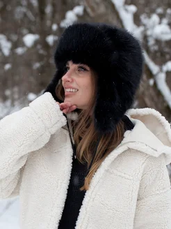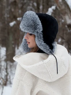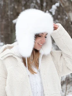 Шапка-ушанка зимняя вязаная из экомеха песца на флисе